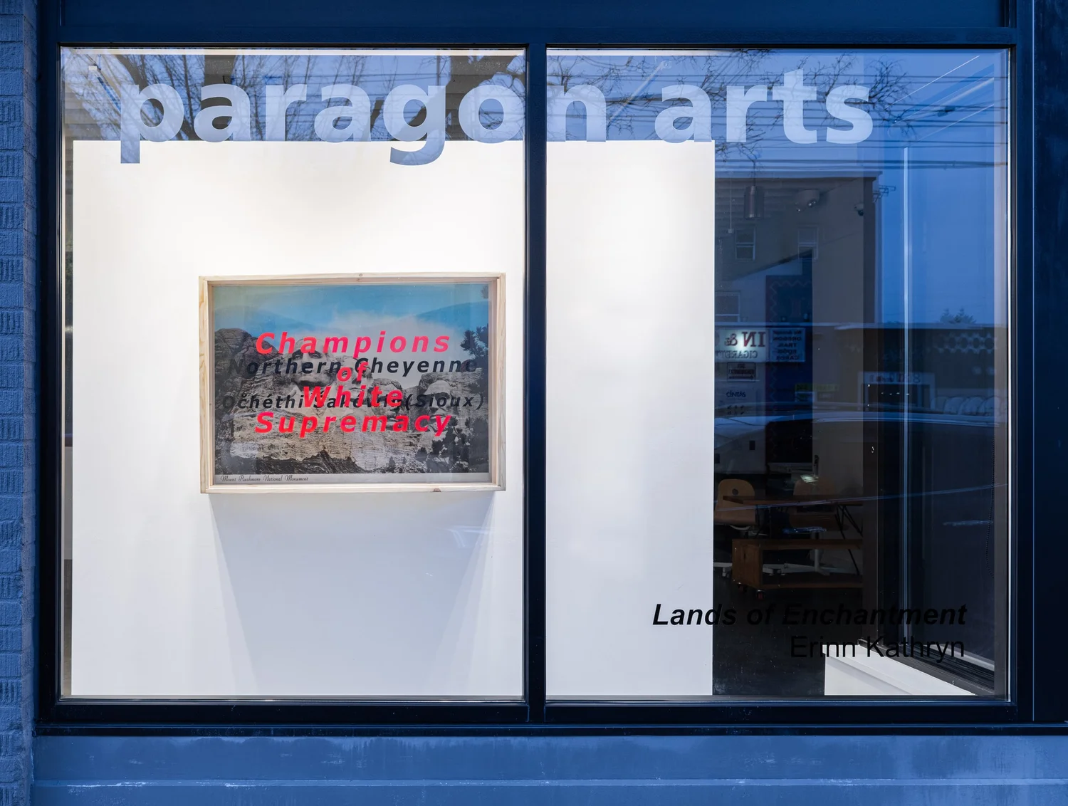 In these dioramas, idyllic postcard imagery is obscured by truths: black text listing the indigenous tribes who have stewardship over the land and red text revealing an unspoken truth about the condition of that land.